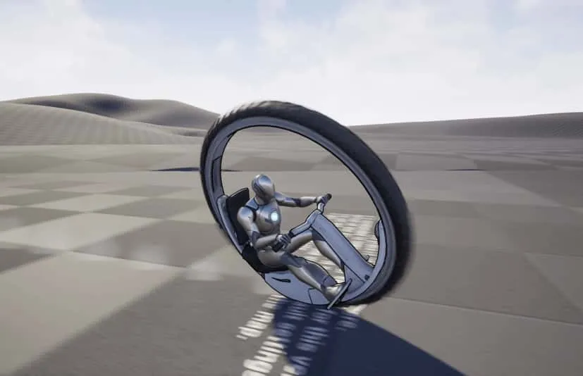 该包包含一辆单轮自行车,以及骑手的动画、尘埃痕迹的粒子效果和运动的音频。自行车本身有一个核心Actor,然后设置了一个演示的第三人称角色(或UE5版本的2个)来骑它,以及一个基本的追踪和消息节点,用于根据请求与它交互/输入它。这辆自行车可以像普通自行车一样沿着地面骑行,也可以在需要时变成飞行器在空中移动。