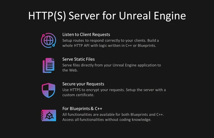 该API完全可用于蓝图,无需触及任何一行C++即可在虚幻引擎游戏中设置HTTP(S)服务器。