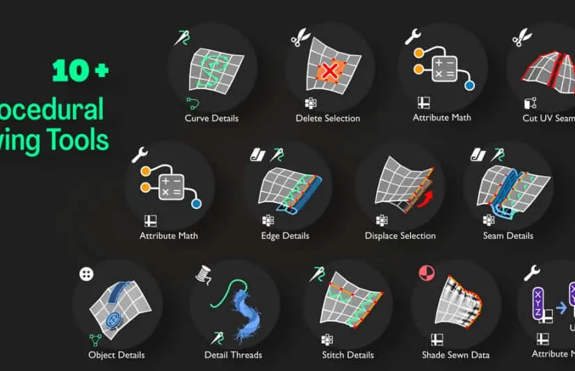 Cloth Sewing Toolbox 是一组程序化工具,利用 Blender 的几何体或着色器节点,只需从简单的顶点组选择中单击几下,即可为服装添加复杂且完全程序化的缝纫细节,这甚至在模拟或动画之后也是如此,这要归功于 UV 空间计算。这些工具允许添加针迹、下摆、接缝、斜装、胶带、粘合、纽扣、表面装订补丁、接缝起皱等。