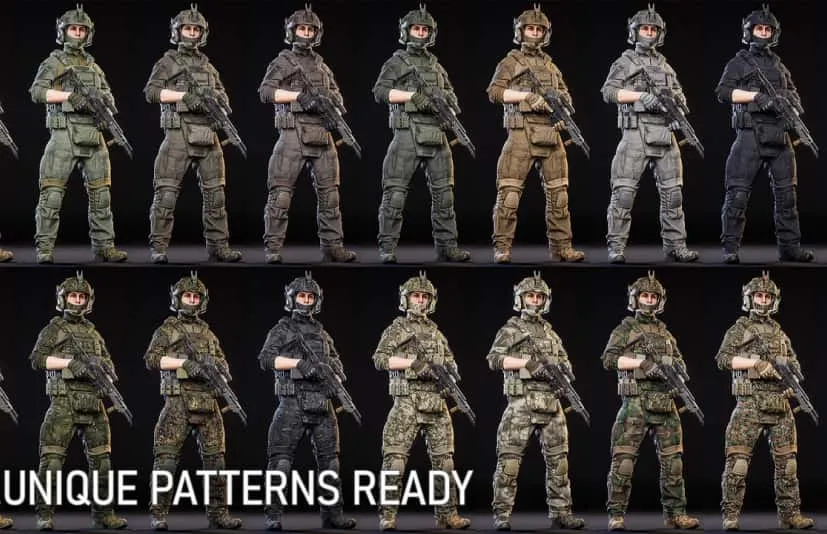 该包装包括世界现代军队的 10 种瓷砖迷彩纹理。这些是美国变体(多机位、森林多机位、marpat 等)、德国、乌克兰像素、荷兰林地等。