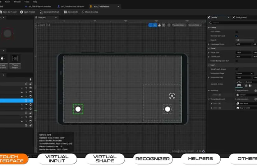 触摸界面设计器还添加了许多基本触摸界面所缺乏的功能,例如实时修改触摸界面、检测手势(点击、双击、长按、拖动、滑动、旋转、缩放等)或有用的功能,如自动移动、拖动冲刺、触摸区域、增强输入兼容性、材质动态实例兼容性和更多功能……